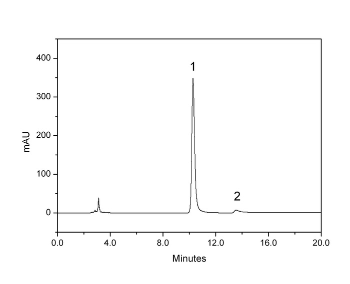 0.2 mg/mL Cefepime and 0.05 mg/mL L-Arginine in mobile phase 1.Cefepime (頭孢吡肟) 2.L-Arginine (精氨酸) |
